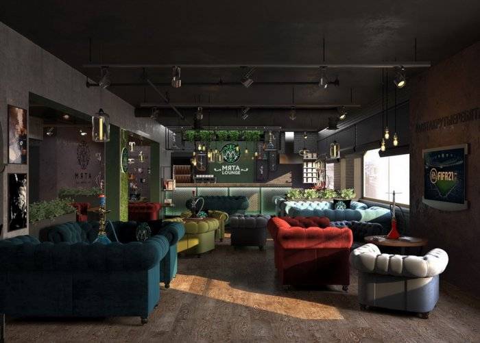 Дизайн-проект выполнен в рамках франшизы лаунж-баров «Мята», но не лишен индивидуальности.